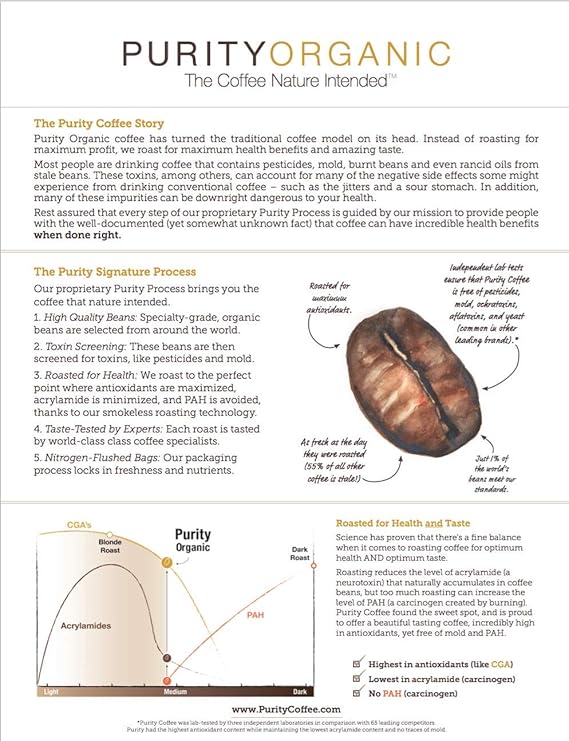 Purity coffee is certified organic specialty grade antioxidant rich and lab tested to be free of mold and mycotoxins.