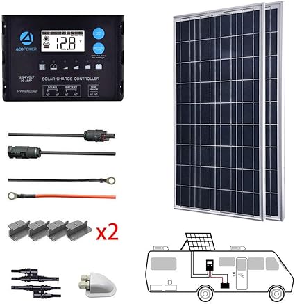 Amazon Com Acopower 2pcs 100w Solar Kit 200 Watts 12 24 Volts Polycrystalline Panel Solar Rv Kits With 20a Pwm Lcd Charge Controller Mounting Brackets Y Connectors Solar Cables Cable Entry Housing Garden Outdoor